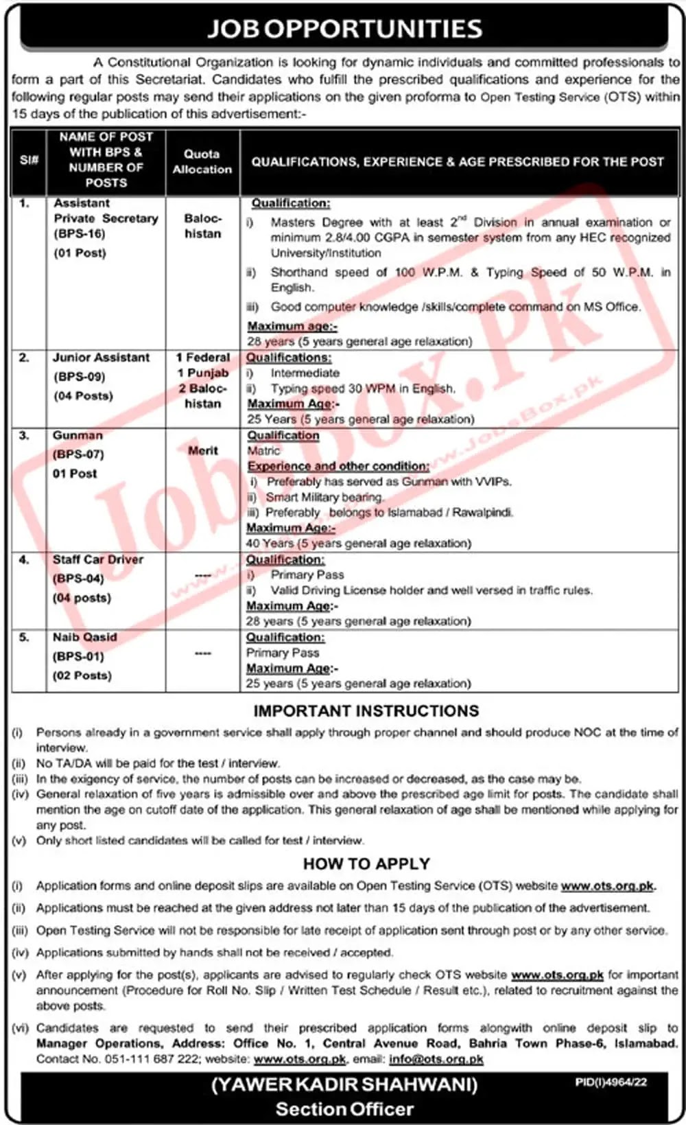 Senate of Pakistan Secretariat Islamabad for Junior Assistant (BPS-09), Gunman (BPS-07), Staff Car Driver (BPS-04), Deputy Messenger (BPS-01), and Assistant Private Secretary (BPS- Jobs are opening. 16).